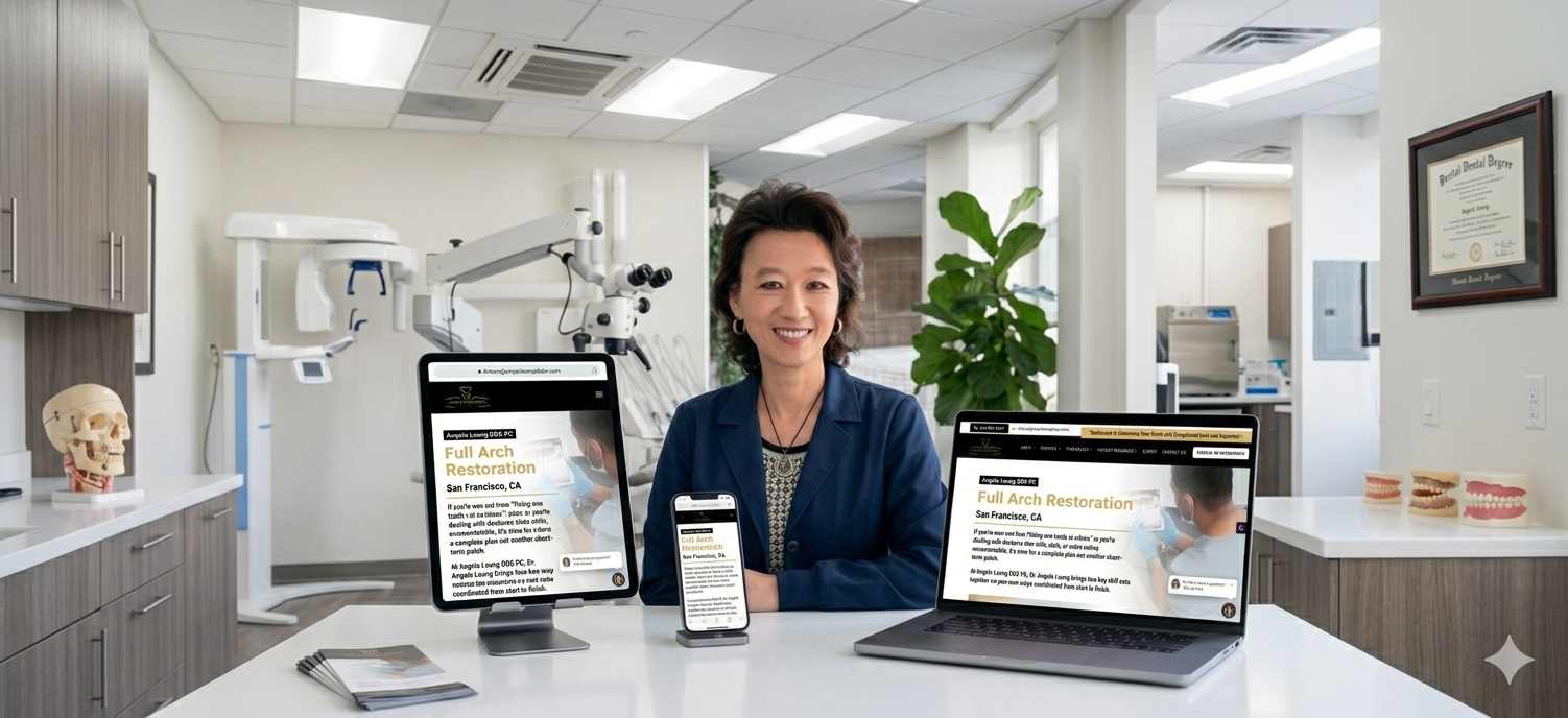 Dr. Angela Leung is a dual-specialty clinician with advanced credentials in both endodontics and implant dentistry. A former UCSF instructor and international lecturer, Dr. Leung operates a high-caliber practice serving South San Francisco, Daly City, San Bruno, San Mateo, and the broader Bay Area. Despite her exceptional clinical reputation, her digital presence did not reflect the authority she commanded in professional circles. Patients searching for root canal specialists or dental implant providers in the Bay Area were not finding her practice online.
